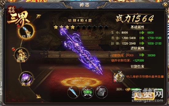 神器,提升切割,吸血,破甲。刷BOSS无压力,刀刀切割热血澎湃,无数极品装备满地爆。