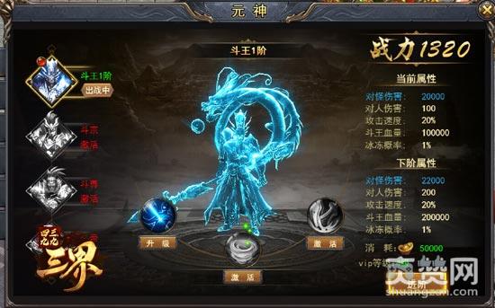 元神:激活后可获得元神专属技能,装备:可通过各种BOSS掉落斗转魂石合成获得元神专属装备