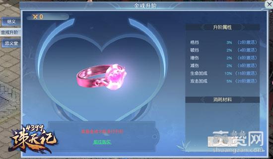 结义当然还要有信物的加持,结义双方可以购买金戒,装备金戒还可以进行升阶,金戒进阶可以获得大量属性。属性包括格挡、破挡、增伤、减伤、生命加成和攻击加成等。