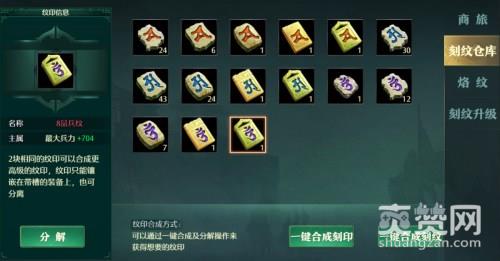 刻纹分别主掌攻击、防御、兵力,同类的刻纹只能装在装在一件装备上,两枚同级的刻纹放在一起合成,就可以升级为更高一级的刻纹,刻纹品阶越高,增加的攻击、防御、兵力也越大,同时也可以增加战斗力,到达一定级数的刻纹,可以合成出更强的烙印,?烙印不损伤刻纹,而且还可以随意和装备分离,就看各位主公如何灵活运用哦。