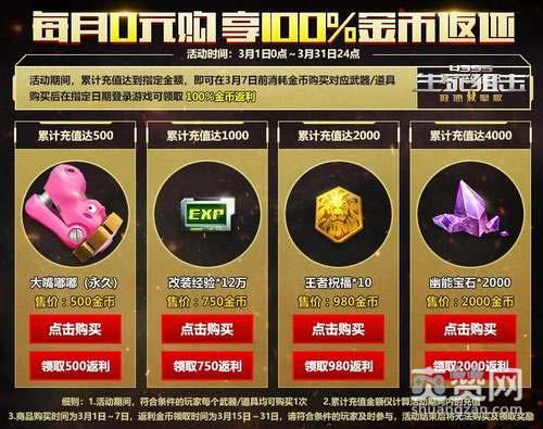 3、商品购买时间为3月1日~7日24点,返利金币领取时间为3月15日~31日,请符合条件的玩家及时参与,活动结束后将无法购买及领取奖励。
