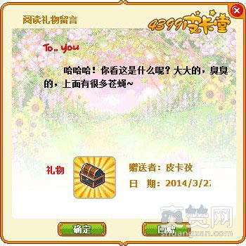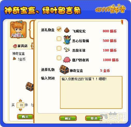皮卡亲选择神奇宝盒或绿叶留言条,点击购买后会弹出一个面板。可供填写一段礼盒祝词(100字以内),写完确定后得到一个打包好的“飞蝇坨坨、恶心垃圾桶、恶臭长袜或僵尸的夜宵”。