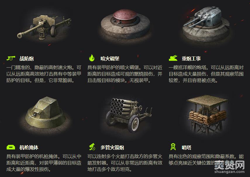 另外,战略家还可以根据擅长的打法风格,从六种防御工事中的选择三种来辅助您作战,在战斗开始前的倒计时期间,您可以将防御工事及坦克部署到地图上的关键位置。每种防御工事都作用独特且具有自身的效果范围,共包括战防炮、喷火碉堡、多管火箭炮、哨塔、机枪掩体、重炮工事这六种,虽然战略家无法直接控制防御工事,但通过一系列部署,也将成为您反击敌军的利器!