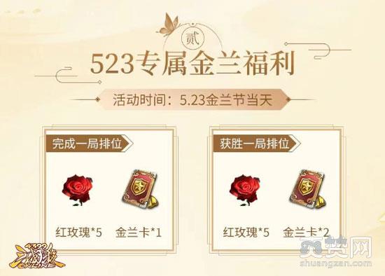 5月23日金兰节当日,将开启全新赛季,获得额外不掉星次数。完成一局排位即可获得红玫瑰*5+金兰卡*1、获胜一局排位可以获得红玫瑰*5+金兰卡*2。