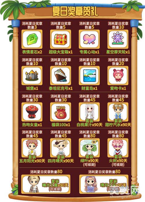 累计消费10000金币后,每额外消费1000金币,即可获得一份“夏日奖章”,使用“夏日奖章”兑换特别奖励:
