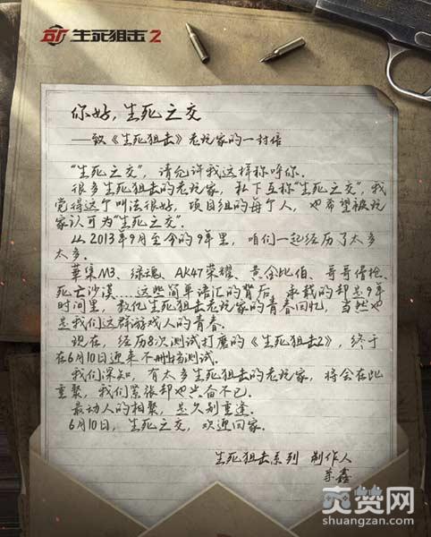 全新战场将启,生死狙击系列制作人特此手书一封献给全体玩家,期盼老兵们相聚于此次不删档测试。同时,官方开放预创角功能,玩家可通过专题页参与预创角,完成账号创建即可领取比伯角色!