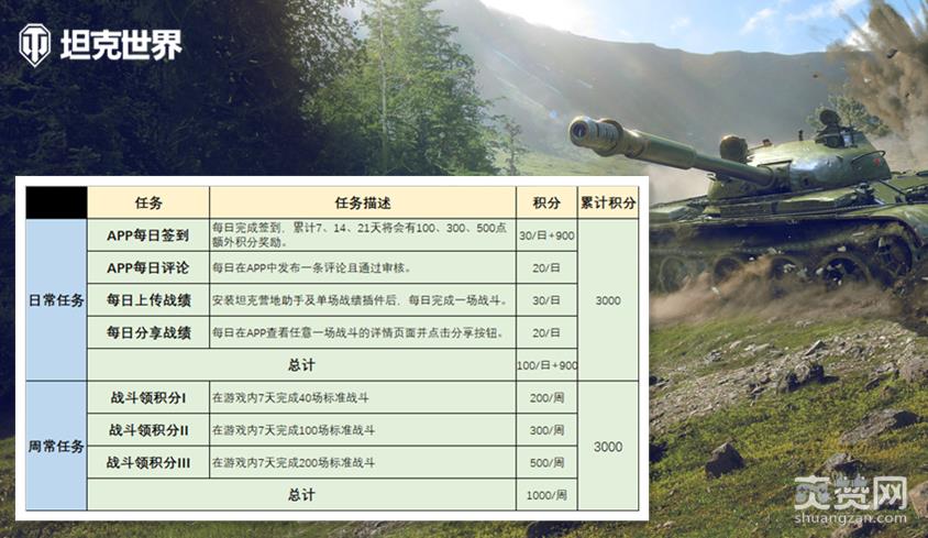 活动期间,您每天只需在坦克营地APP完成每日签到与评论,并安装PC端坦克营地助手单场战绩插件,在标准模式下进行一场战斗后分享任意一场单场战绩,即可获得累计100积分。除日常任务外,活跃任务还包含了周常任务,每周完成200场战斗,即可获得1000积分。完成所有的21天日常任务与3周周常任务,则累计可获得6000积分。