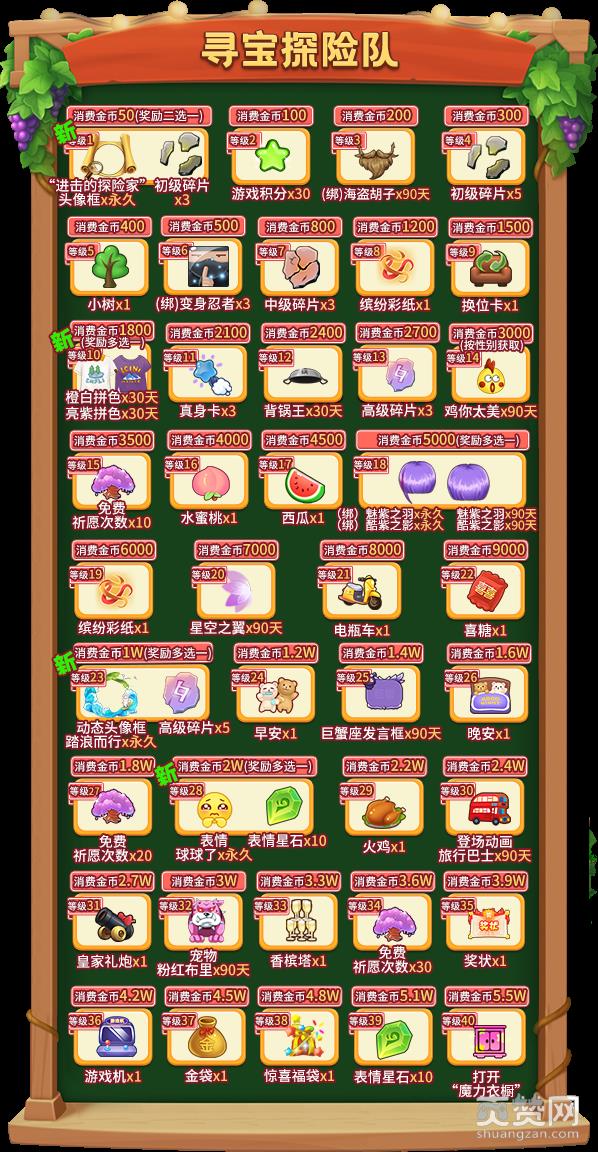 每达到40级即可打开“魔力衣橱”,随机获得其中一套服装(不区分性别),之后重置“寻宝探险队”奖励列表,并回到探险起点,当通过消费金币再次达到40级时,可再次打开“魔力衣橱”。