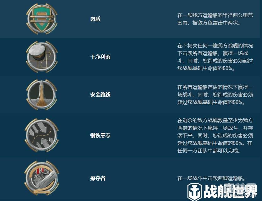 护航战中,为舰长们设置了特殊主题的成就,这些成就将只能在这一模式中获得。如果您在保护运输船过程中,用自己的舰船勇敢的迎向对方的鱼雷,那么就能够获得“肉盾”成就;在进攻方团队时,在精妙的配合下,不损失任何一艘我方战舰的同时击毁所有运输船,并且造成自身舰船50%生命值以上的伤害,就能够获得“干净利落”成就。此外,还有更多特殊主题成就,等待舰长们前来挑战获得。