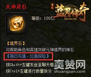 d. 天冲灵石--可通过充值,在每日充值礼包中获得,或进入上古结界通过“位面探险”概率获得