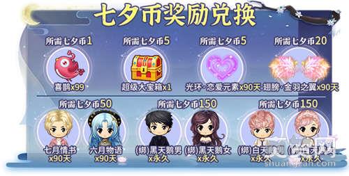奖励二:当累计消费10万金币后,每额外消费1000金币,即可领取一枚“七夕币”,使用“七夕币”,兑换特别奖励(“黑天鹅/白天鹅”套装可用于结婚。)!
