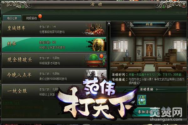 参与活动,不仅能够让我们热血激昂,有时还能为我们带来财富收益。在大黑《范伟打天下》中,精彩活动不间断,只要把握机会,你就可赚得盆满钵盈。科举,斗智斗勇;一统全服,实力较量;皇城镖车,全力一击,此外还有多样丰富活动,将给予你各种赚取金钱的机会,助你成就财主之名。