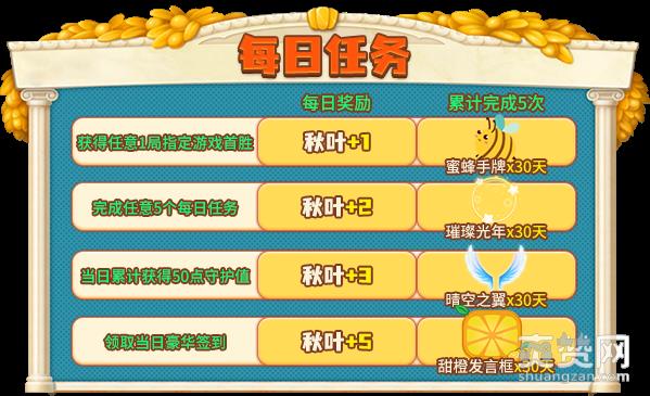 活动期间,新增每日额外任务,每完成一项任务,即可获得“秋叶”奖励!每项任务累计完成5次,还能领取额外奖励!