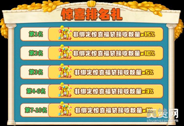 并且,按每个玩家累积接收的非绑定“惊喜福袋”数量进行排名,活动结束后为排行榜前10名玩家发放排名奖励!