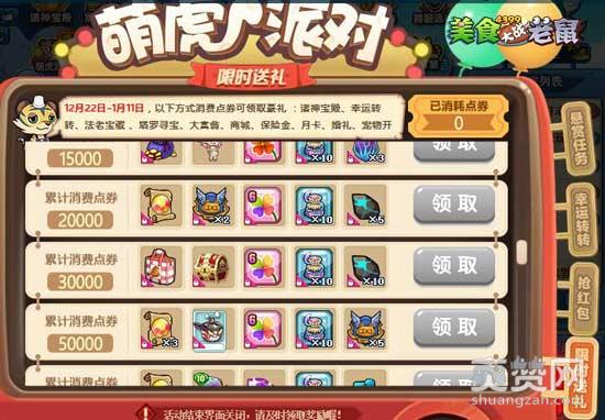 活动期间消耗点券可以在萌虎派对-限时送礼界面领取丰富奖励。本期赠送返场生肖礼券、怀石料理食神谱、猛虎高压锅等丰富奖励,大家可前往可自行兑换处兑换喜爱的生肖卡~