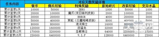 测试期间内,累计登录冒险测试服达到相应天数,可在该服获得登录奖励。变异水晶可兑换冒险道具,原始碎片可兑换英雄武器与黄金武器。