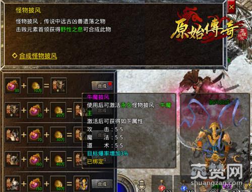 在北方雪原及相关地图中,击败元素首领即可获得【野性之息】道具,玩家可通过【北方雪原】-【怪物披风】处消耗野性之息与传奇币合成怪物披风。