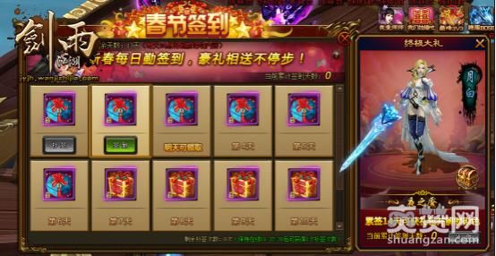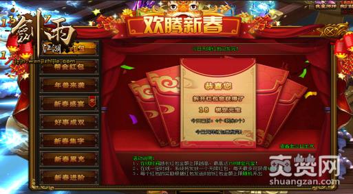 新春每日勤签到,好礼相送不停步!在玩机之家《剑雨江湖》春节盛典活动期间,玩家每日登录即可获取丰厚礼品赠送,装备精炼石、元魂珠免费等你拿!累积签到14天更有炫酷染色免费送哦!如果有大侠们忘记签到了也不要着急,因为每在线2小时,可获得1次补签次数,而且当日未登录,次日可通过补签领取奖励哦!在大侠们登陆后就可以领到我们会大家准备的红包啦。天降红包喜相聚,鸡年福瑞耀满堂,活动期间,玩家每日在线一定时间,系统会发放丰厚的红包供领取,在线时间越长,红包金额上限越高。点击领取可随机获取不定额红包,不过最多只能领取四个红包哦,祝各位大侠次次拿大奖!