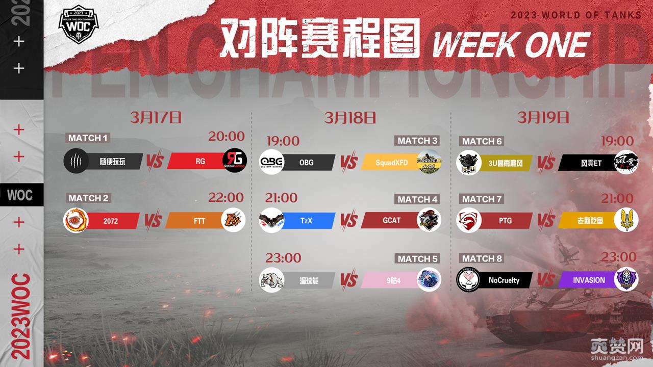 首周的比赛将于3月17日晚20:00打响。小组赛的首场对决便是由中鹏飞领衔的「随便玩玩」将对阵雨晴带领的「RG」战队,本周一共将上演8场紧张激烈的对决,对阵和时间如上。各大豪门战队悉数出战,诸多明星选手战场捉对厮杀,谁能在残酷的7V7对决中斩将夺旗,为战队首开纪录?战火一触即发!