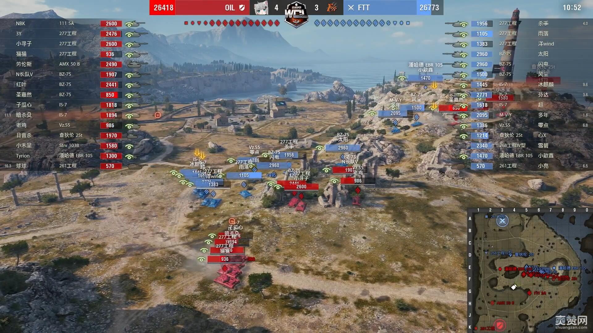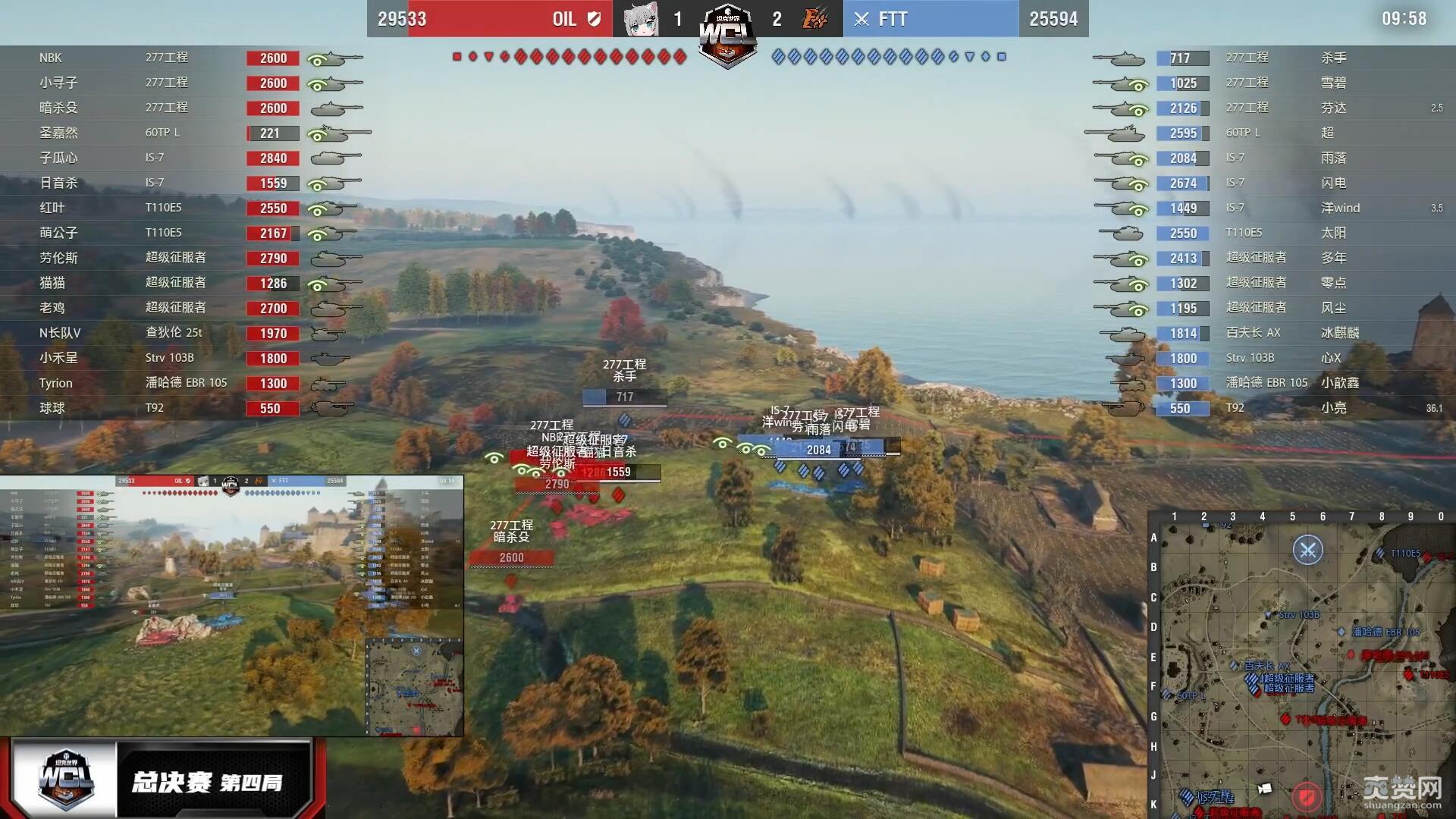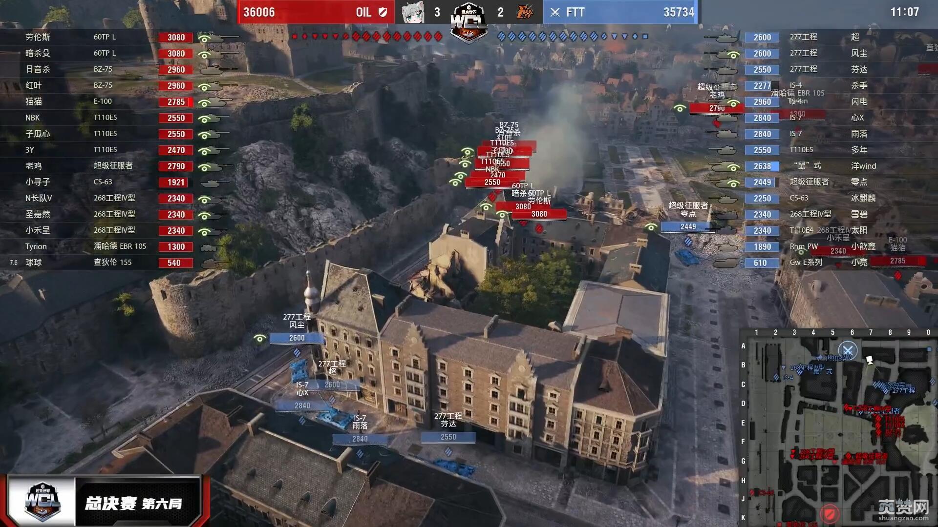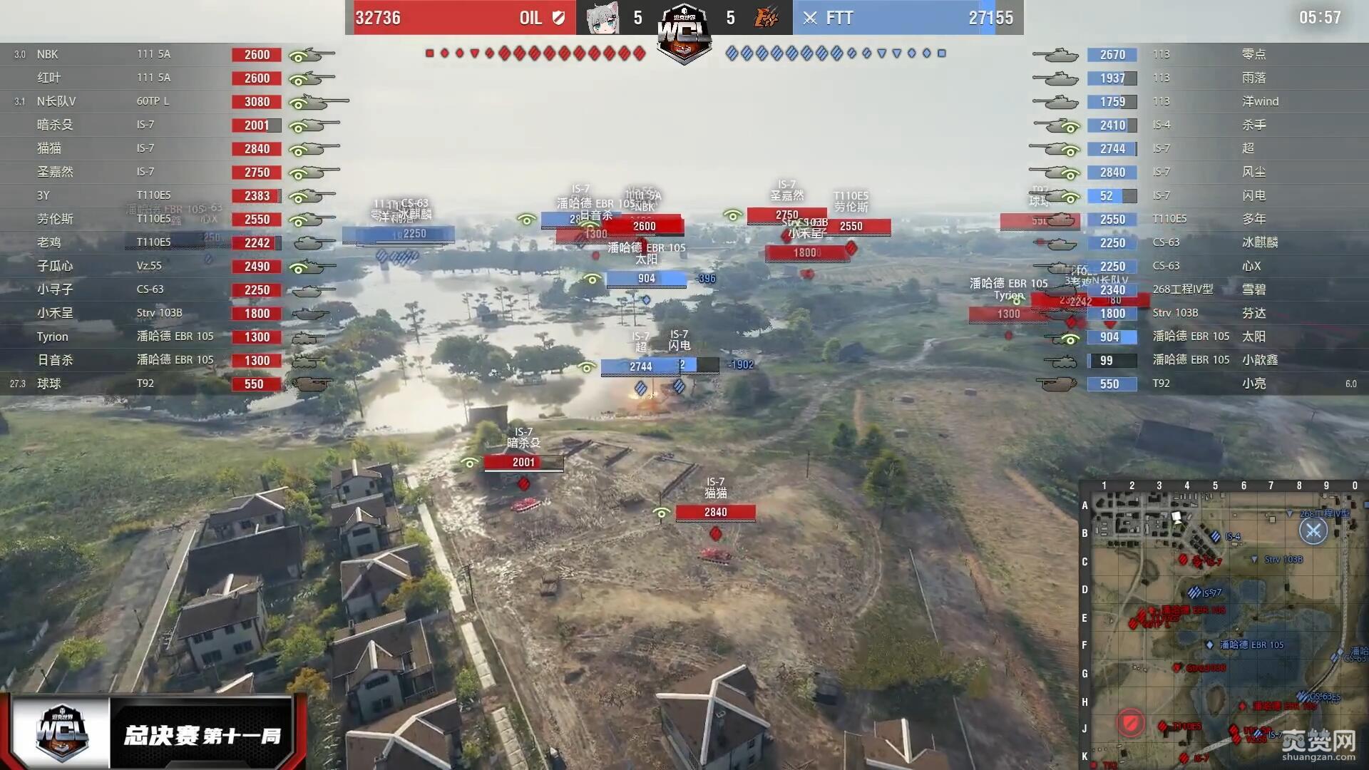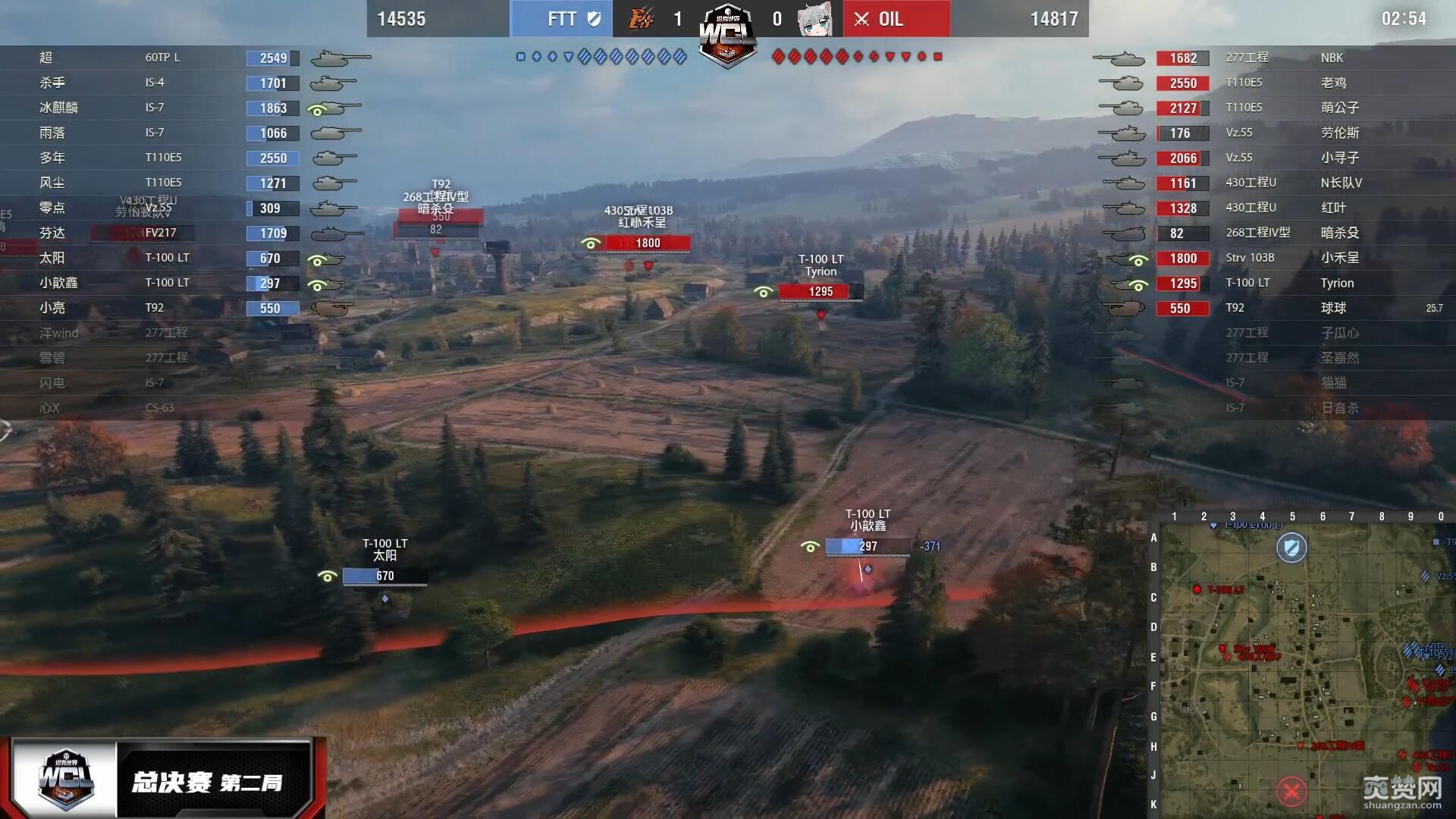 决胜局地图里夫奥克斯,在前10场战斗中获胜更快的OIL再次获得优先选边权,选定防守方。OIL以IS-7佯防城区、主力重防K线铁路与湖岸反斜面开局。而FTT在城市外围集结兵力后反复犹豫,最终未决定从1-3线发起强攻,转而斜插湖岸反斜面并助攻K线铁路,正中OIL下怀!