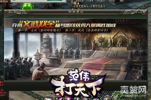 除开服第一天的新服外,游戏于每日中午12点30分和下午15点30分都会开启科举活动。科举分为文试和武试两部分,玩家通过答题、比武可获得大量银两、经验等奖励,但是,只有在文试中获得满分,即所有题都答对的玩家,才能进入武试。