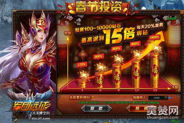 春节投资活动时间为1月21日-1月23日,在此期间,玩家于37《大天使之剑》中投资一定钻石,即可享受15倍绑钻超高额度返利,投资的钻石将全部转换为绑钻,直到1月23日结束投资,系统将开始计算投资的利息,参与活动的玩家每天可额外获得前一天绑钻总额的20%做为回报,利息可持续累积15天,而在这15中每天所获得的利息收入各不相同,玩家要留心观察。在1月28日后可提取投资中的绑钻,但只能一次性全部提取,投资提取后将不会在累积获得绑钻。