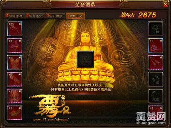 每件装备都有若干个宝石镶嵌孔,玩家可选择一件有多余镶嵌孔的装备,再点击界面右侧宝石栏中的宝石,即可将宝石镶嵌到装备上,提高玩家相应的属性。此外,给37《西游伏妖篇》里的装备开光还可以带来属性的飞跃式提升,但是只有橙色以上、且强化+10的装备才能进行开光哦!