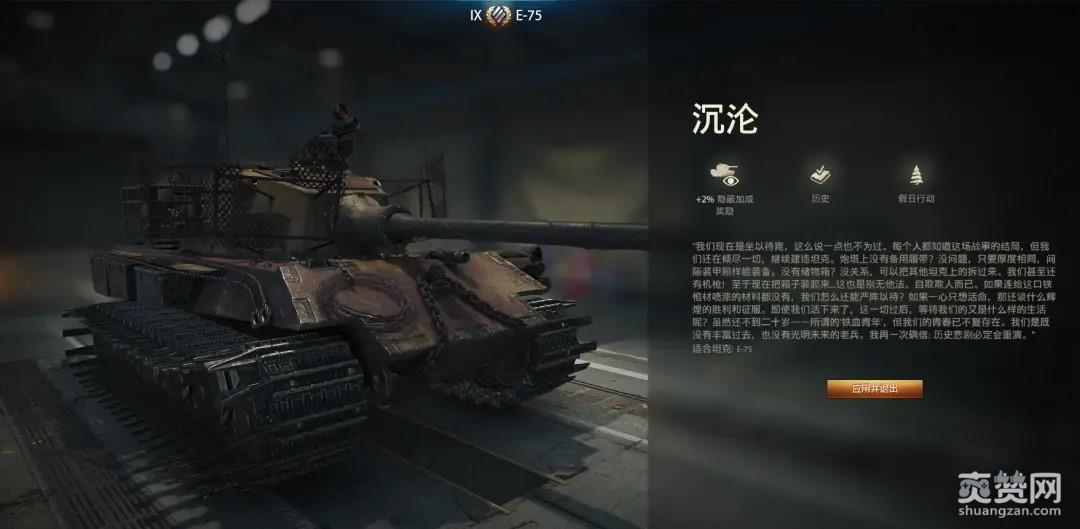 《坦克世界》假日行动2024还在火热进行,在假日补给箱中,玩家们可以开出多款坦克与3D风格。其中, D系9级重型坦克E-75的专属3D风格“沉沦”当值一提,无论是坦克本身,还是涂装元素都充满着现世意义,同时“沉沦”也是游戏中高度还原历史3D涂装之一。