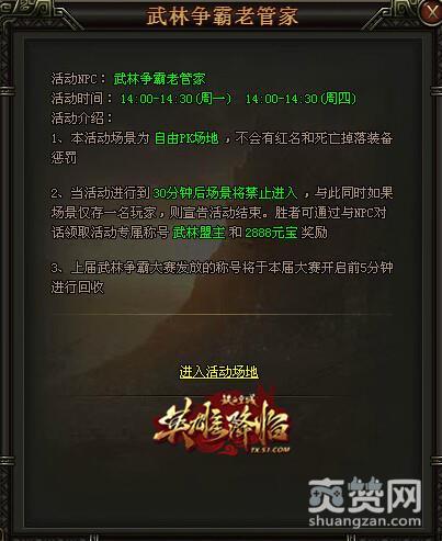 小长假归来,是不是还没有适应上班的节奏,那就来51《铁血皇城》激情一战,重寻往日的酣畅淋漓!每周一、周四14:00-14:30就会开启武林争霸大赛,从铁血土城NPC武林争霸老管家处可以进入活动地图,不过要等级达到80及以上才有资格哦!武林争霸为自由PK场地,不会有红名和死亡掉落装备惩罚,当活动进行到30分钟后禁止进入,与此同时如果场景内仅存一名玩家,则宣告活动结束。胜者可通过NPC对话领取活动专属称号——武林盟主和2888元宝奖励,并且一上线就有提示,简直不要太拉轰哦!
