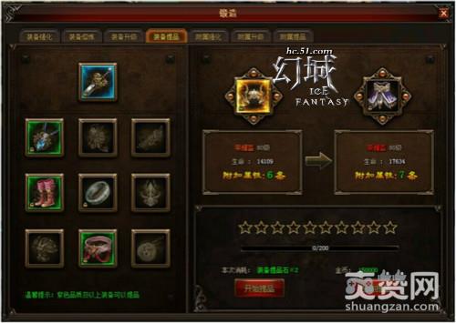举例来说,装备强化是51《幻城》页游中装备获取之后的第一种培养方式,而装备的强化在游戏中也是拥有非常高的地位,装备一共有10种,所以每一种装备的战斗力提升1000,那么总战斗力就会增加一万点,无论是练级还是PK中的优势都是极其巨大的。目前游戏中装备能够提升的最高星级是10星,在游戏中10星转给也就是非常强悍的存在了。另外大家需要注意一个问题那就是随着装备的强化等级不断的提升,装备强化的成功率也会不断的降低,玩家们需要量力而行哦。