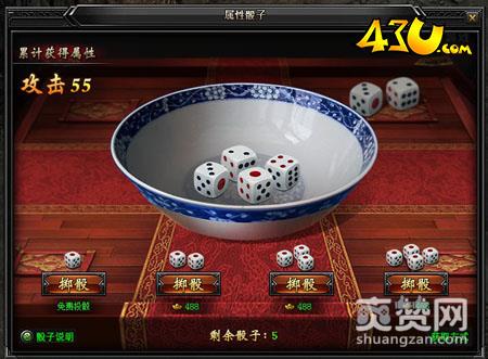通过双击可打开骰子界面,其中有四个按钮,即1个骰子、2个骰子、3个骰子、4个骰子。投掷不同数量的骰子,需要的元宝也是不同的,对应的分别为免费投掷、488元宝、888元宝和1288元宝。