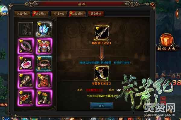 装备的套装可以通过精炼来升阶,神主套装可以精炼成娲皇套装、娲皇套装可以精炼至尊套装、至尊可以精炼神锻。精炼装备需要消耗精炼石和银两,提升的装备等阶越高需要消耗的精炼石品质越高。装备精炼之后附加属性会被直接重置,想要拥有极品附加属性,可以消耗重铸石重铸装备。