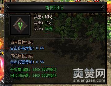 最后一个是协同印记,协同印记当前属性加成是合击伤害增加:0.4%,下级属性加成是合击伤害增加:0.8%,升级需消耗:12000战纹精华,回收可获得:6000战纹精华。合击的作用就是和你的英雄两人发起合击技,合击技有冷冻CD,一旦CD满了就能释放强大的攻击,这种攻击比暴击更强,一击之下就能打出平时3倍、乃至4倍的伤害。再加上这个战纹,对敌人,特别是BOSS的伤害值更是锦上添花。