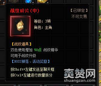 实际测试中,掉落率最高的就是战纹碎片(中),而且一次性掉落的量也非常多,往往是几个,十几个一下子。战纹碎片是通过双击使用的一种战纹道具,中型的使用后会增加50点战纹精华,可用于战纹升级。