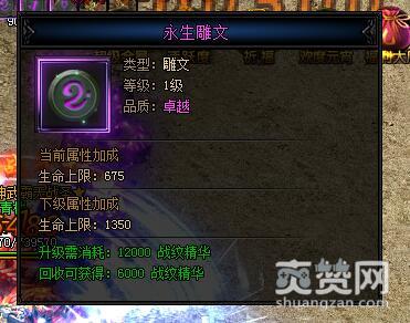 永生雕文。类型:雕文,等级:1级,品质:卓越,当前属性加成——生命上限:675,可以看出生命上限加成与点1个提升生命上限的天赋相比,要高出不少,而且雕文还可以升级,下一级的属性加成生命上限更是高达1350,足足增加了一倍。升级需消耗:12000战纹精华,回收可获得:6000战纹精华,这个量也是非常高的。