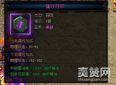 强攻符印。类型:符印,等级:1级,品质:卓越,当前属性加成——物理攻击:48-48,如果你的角色是战士,那么使用这个战纹是非常不错的选择,因为它主加的物理攻击,而且加成属性值也比单点一个物理攻击的天赋高,下一级的属性加成物理攻击更是高达81-81,下级属性加成物理攻击时162-162。升级同样需消耗:12000战纹精华,回收可获得:6000战纹精华。