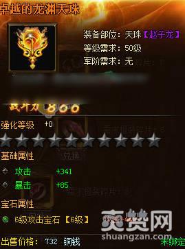 卓越的龙渊天珠是50级赵子龙的天珠装备,需要8个橙装碎片进行兑换。