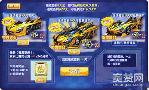 玩家连续签到8天可以获得永久的C级赛车——电光火石!连续签到满21天即可升级为永久B车——流星赶月!当然最重要的就是在连续签到50天时,就可以获得永久A车——追风逐日 !!!!!现在起只要参与活动,便可获得时间回溯卡进行补签哦!不慎漏签的小伙伴赶快来参加吧!
