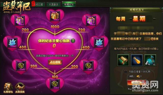 每一个结婚纪念日都是对这一天这一个决定的感恩和珍视。在《盗墓笔记》中,夫妻的初始结婚日期都将登记在案,而每个月的这一天就会被定为结婚纪念日。当结婚纪念日到来时,夫妻可以选择互相赠送三种礼物,每送出一份礼物,都将获得固定的爱心指数。纪念日到了,记得准备一份甜蜜的小惊喜送给你的TA哦~