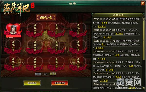 所有未婚玩家都可以通过“喜结良缘”向《盗墓笔记》里所有的单身玩家发出单身公告,等待有缘人相识。也可以选择你想要表白的对象,直接“发起求婚”。发送求婚邀请后,对方将有300秒的时间考虑是否接受你的求婚。在这300秒中,快快拿出你的勇气给心爱的人一个爱的宣言吧!