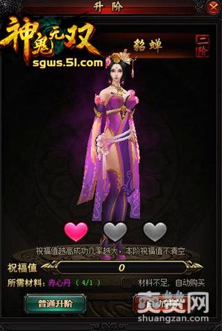 古时皇帝后宫佳丽三千,个个拥有绝世美貌,如今你只要在51《神鬼无双》即可体验到坐拥爱妃的满足感!玩家可通过主线任务获得忠实的练级伙伴——限时貂蝉并激活爱妃功能,不仅拥有强大的群攻能力,而且可以为主人增加属性,如此爱妃简直可称得上是贤内助啊!爱妃如此尽忠职守的帮助你一路斩妖杀敌,当然也要对爱妃升阶,升阶需呀消耗赤心丹,可在副本大厅挑战爱妃副本或者商城购买获得。