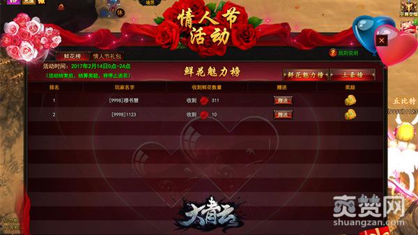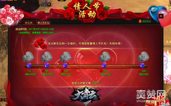 美酒配佳肴,鲜花赠佳人,浪漫的情人节岂能少了鲜花的点缀?本次《大青云》情人节活动,我们为各位玩家准备了“鲜花魅力榜”和“土豪榜”,玩家们可以相互赠送玫瑰花,当送出的鲜花达到一定值时便可领取情人节礼包,有装备升星石、高级升星石、宝石碎片、绑定元宝、幸运宝箱等多重专属豪礼。