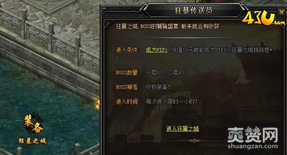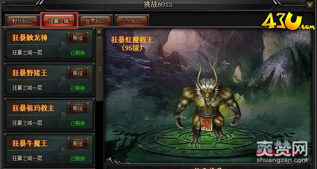 狂暴之城共两层,一层8个BOSS,一个4个BOSS,有狂暴触龙神、狂暴野猪王、狂暴祖玛教主、狂暴牛魔王等等,BOSS等级不同,战力也不同,玩家击杀它们可以得到掉落的终极装备,玩家每次进入限时一小时。