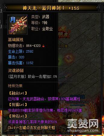 神天龙·蓝月神剑I。类型:武器,等级:7转,职业:全职业。基础属性——物理攻击:864-4320,生命上限:2592,暴击:320,暴击伤害:1152。灵魂锁链——【蓝月衣服】:致命一击增加2.0%。特殊效果——【融合Lv1】:已与神·天龙武器融合,获得其130%基础属性。【祝福Lv1】:攻击时15%概率获得增伤效果,每层提升5%伤害。【神佑Lv1】:该装备掉落几率降为原来的50%。