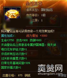 玩家在商城内花费1688元宝,就能够获得1个月的皇钻至尊效果加成。