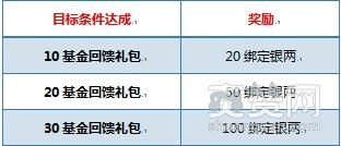 活动时间:开服前7天活动规则:活动期间全服购买基金人数达到指定条件,可领取回馈奖励(奖励