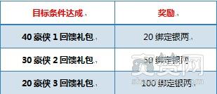 活动规则:活动期间全服豪侠玩家人数达到指定条件,可领取回馈奖励(奖励请在活动期间内领取)。