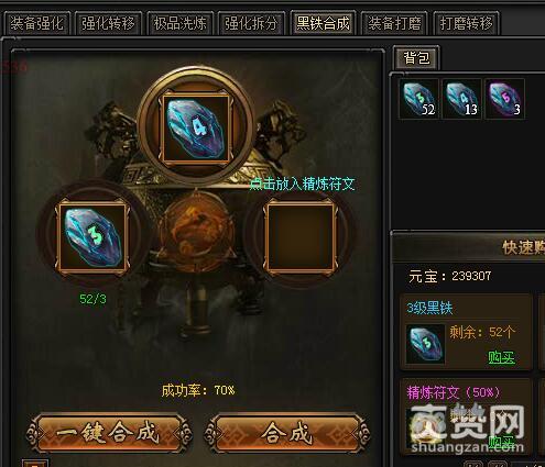 黑铁合成可以把低级黑铁合成高等级黑铁,3个同等级黑铁可以合成高一级黑铁,合成材料中有一个绑定,合成获得的高级黑铁即为绑定。合成黑铁有一点的几率失败,可以投放不同成功几率的精炼符文来提高合成成功率。