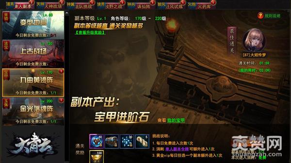 《大青云》九曲黄沙阵副本挑战不受时间限制,只要你的角色等级在170级以上即可。每日可免费进入1次,如果你有单人副本令牌,也可直接使用额外进入1次。副本共设3级,初始进入为Lv1,玩家满足170级以上就可以参与到攻打怪物的战斗中了。