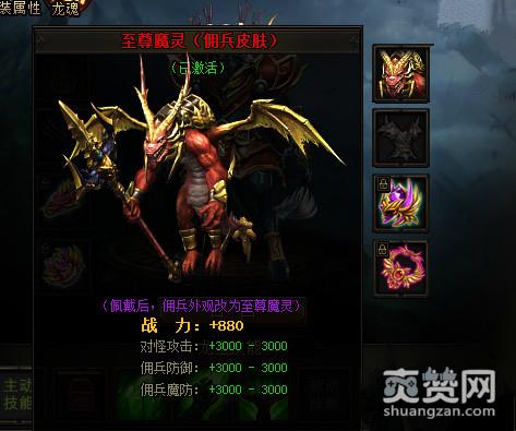 开服活动的时候直接点击至尊魔灵图标点击购买就可以了,购买后不管是佣兵还是龙王都可以使用改皮肤,佣兵皮肤不仅增加佣兵的攻击跟防御,还增加任人物的攻击防御。